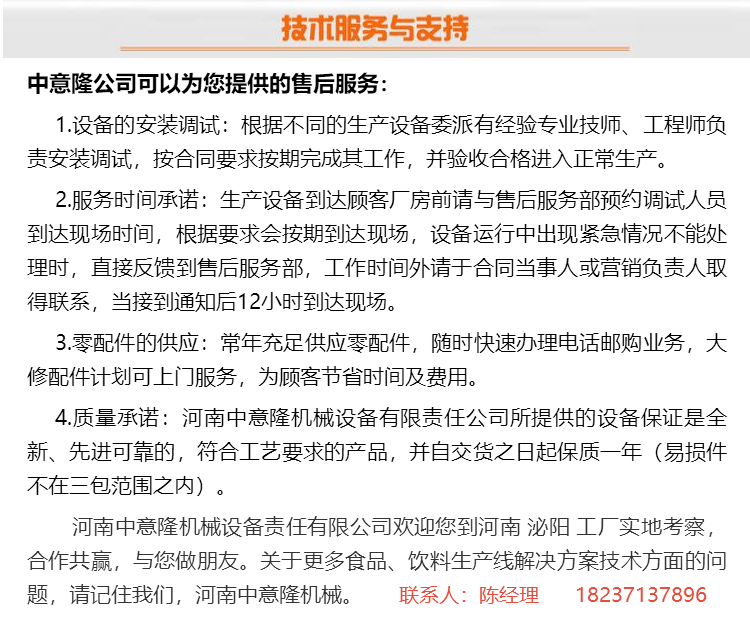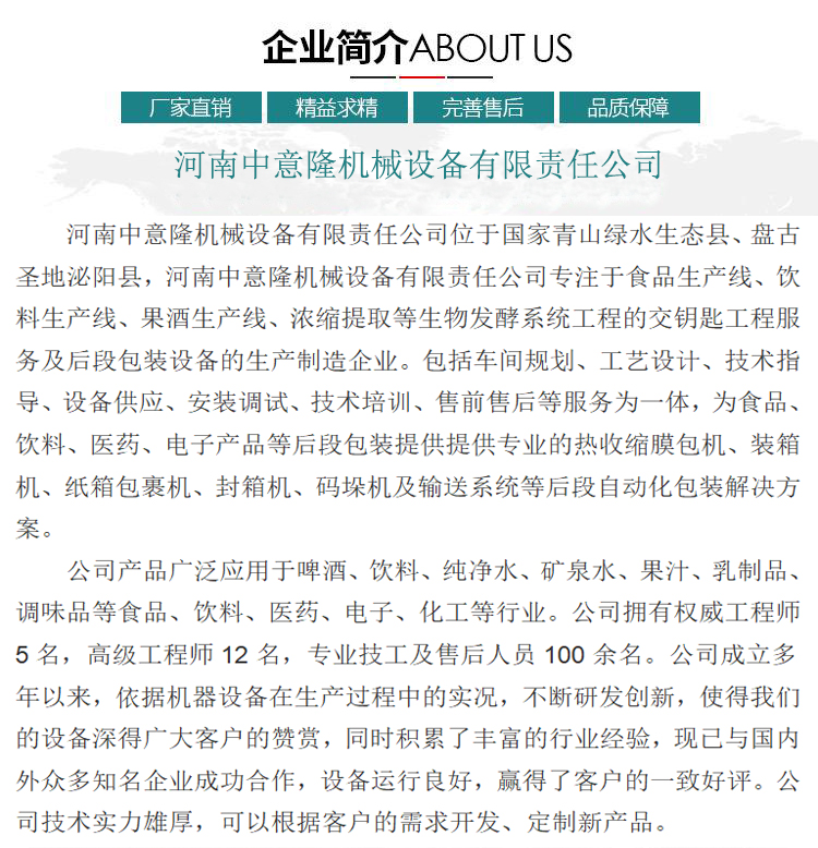 5.出产线后段包拆设备:开箱机、拆箱机、裹包机、封箱机、码垛机等系列产物。可选设备:从动理瓶机某人工理瓶系统、全/半从动洗瓶机、全从动卸瓶机、瓶仓、贴标机、可选设备:若是是新瓶,可选设备:纸箱包拆机等出产能力:我公司曾经构成了完整的系列化产物线ml易拉罐计较)4.玻璃瓶拆设备构成:包罗洗瓶机、瓶预热机、输盖灭菌机、灌拆压盖机、倒瓶杀菌机、冷瓶机、贴标机、拆箱机、码垛机、环绕纠缠机、实瓶输瓶系统、输箱系统、电气节制系统等正在内的一整套灌拆包拆出产线。医疗器械收集互换衣务第三方平台存案凭证(存案编号:(粤)网械平台备字〔2023〕第00024号)3.易拉罐拆设备构成:包罗全从动卸罐机、冲罐机、灌拆封盖机、冷罐机、储罐台、液位检测机、收缩膜包拆机、实罐输罐输箱系统、电气节制系统等正在内的一整套灌拆包拆出产线。包罗水处置系统、饮料调配罐、果酒发酵罐、酵素发酵罐、醋酸发酵罐、生物发酵罐、熟化罐、陈酿罐、无菌罐、果蔬清洗机、果蔬破裂机、生果打浆机、螺旋榨汁机、储存罐、制冷罐、螯合罐、UHT板式杀菌机、UHT管式杀菌机、CIP清洗机等单机。出产能力:我公司曾经构成了完整的系列化产物线ml 玻璃瓶计较)。2.PET瓶拆出产设备构成:从动吹瓶机、风力输送线、输盖灭菌机、理盖清洗机、冲瓶灌拆封盖三联机、倒瓶杀菌机、冷瓶机、吹干机、套标机、喷码机、码垛机、环绕纠缠机、实瓶输瓶系统、输箱系统、电气节制系统等正在内的一整套灌拆包拆出产线。可选全从动卸瓶垛机等。